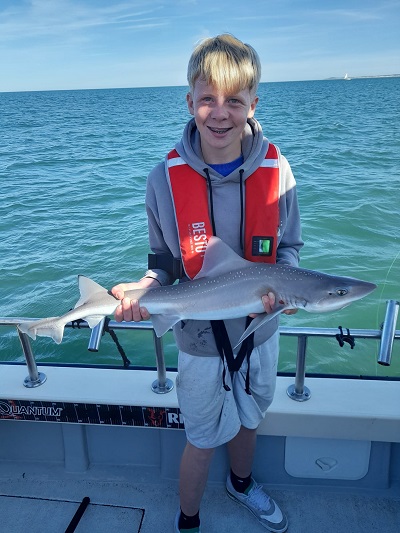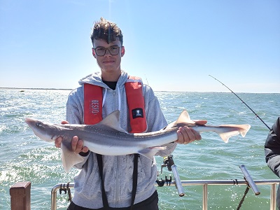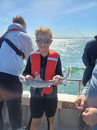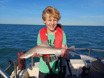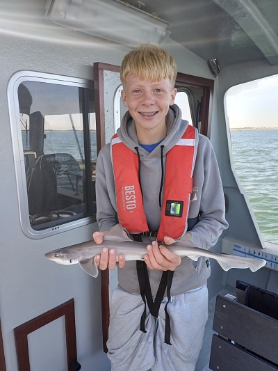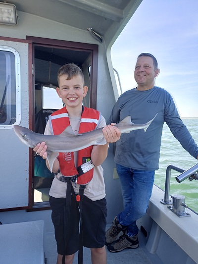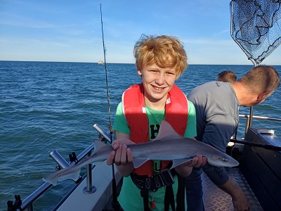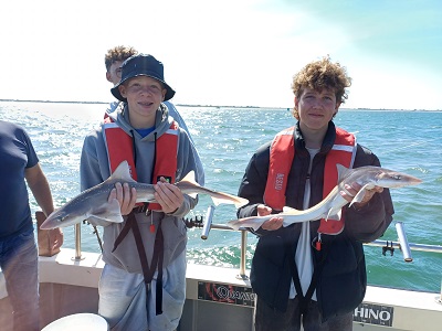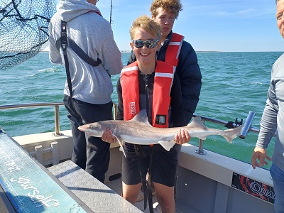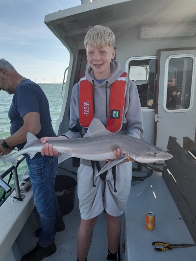 Eindstand van de dag: 36 haaitjes variërend tussen de 40 en 103 cm, 1 scharretje en een emmer aan verschillende soorten zeesterren. Leuk om te zien dat iedereen elkaar een vis gunde, dat resulteerde dan ook dat iedereen een haai heeft gevangen. Een hele leuke ploeg onderling. Kortom een topdag voor zowel de kids als de begeleiding. Dank aan de schipper van Barracuda Sportvisserij en Sportvisserij Zuidwest Nederland voor deze dag. Laten we hopen dat er nog eens een vervolg mag komen….