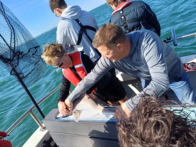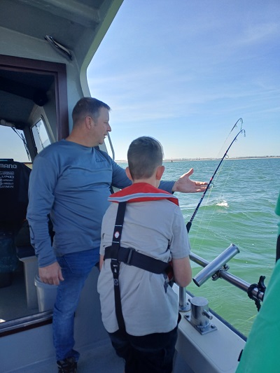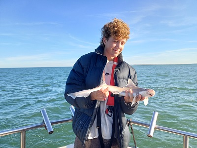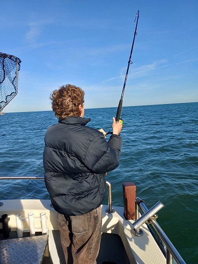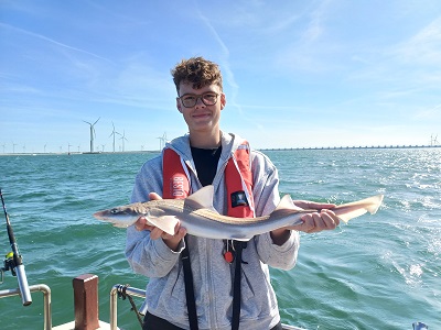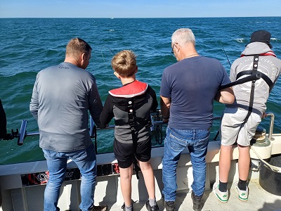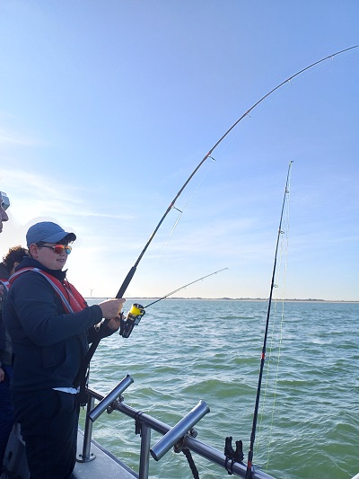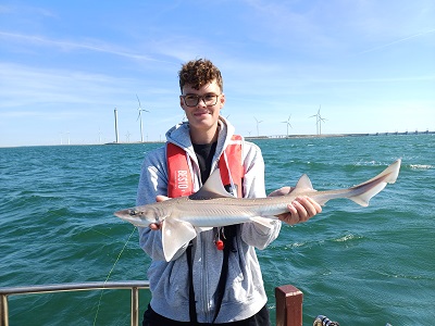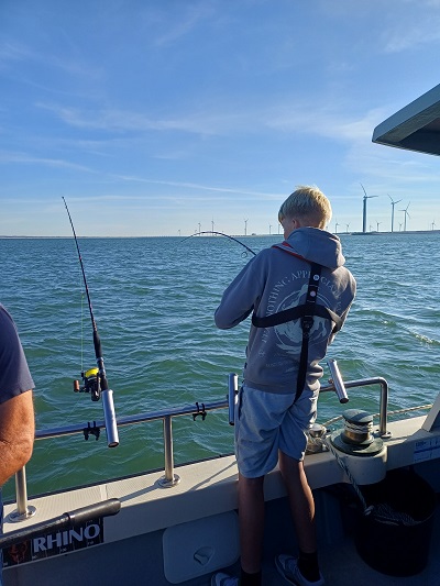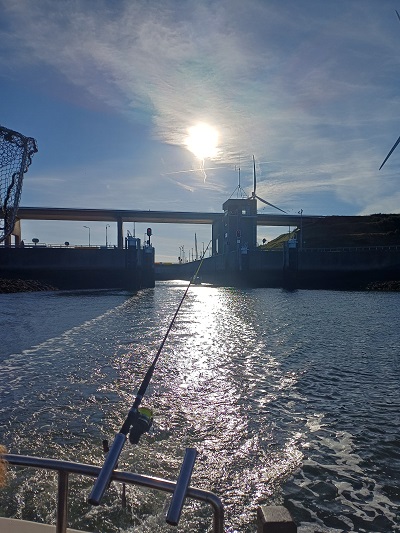 Rond 09:00 uur vertrokken we vanuit de Roompot Marinahaven richting de Roompotsluis om naar buiten te schutten. Niet lang daarna konden de hengels te water en kwamen de eerste haaitjes naar boven. Dat liep zo een klein uurtje door totdat de kentering van het tij, toen ging de stroom er wat uit. De aanbeten lieten het even afweten…. Tijd om zelf maar eens wat te eten. De schipper had een heerlijk broodje worst gemaakt voor iedereen en een blikje fris geregeld om alles goed door te spoelen. Na ongeveer een uurtje werd de keuze gemaakt om even op een ander plekje te proberen. Ook daar kwamen er her en der over de boot wat haaitjes boven water kijken. Zo liep het eigenlijk de gehele dag redelijk door. Begin de middag begon de wind wat meer aan te trekken en hebben we nog even gevist vlak voor de kering, waar we wat meer uit de wind en stroom lagen.
